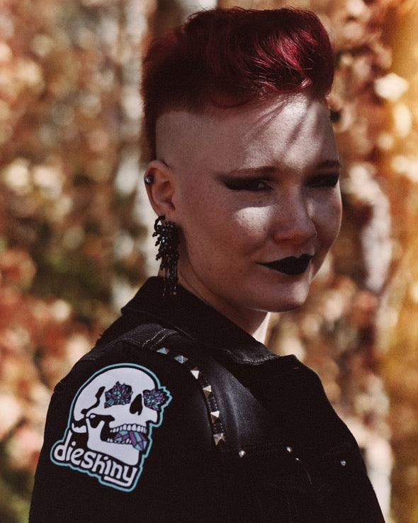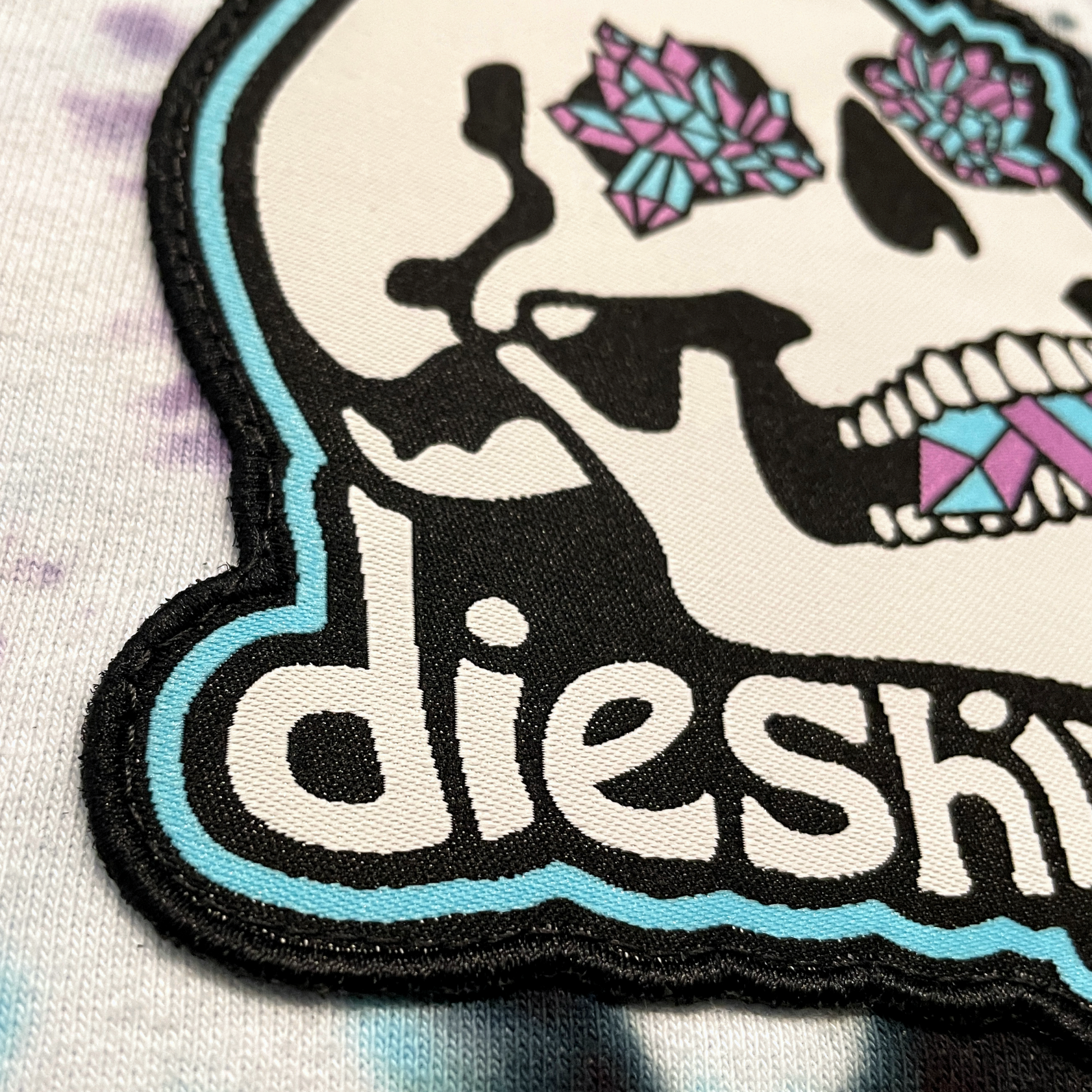Our little friend, their mind exploding with existential bling, immortalized on a woven patch 💎💀💎